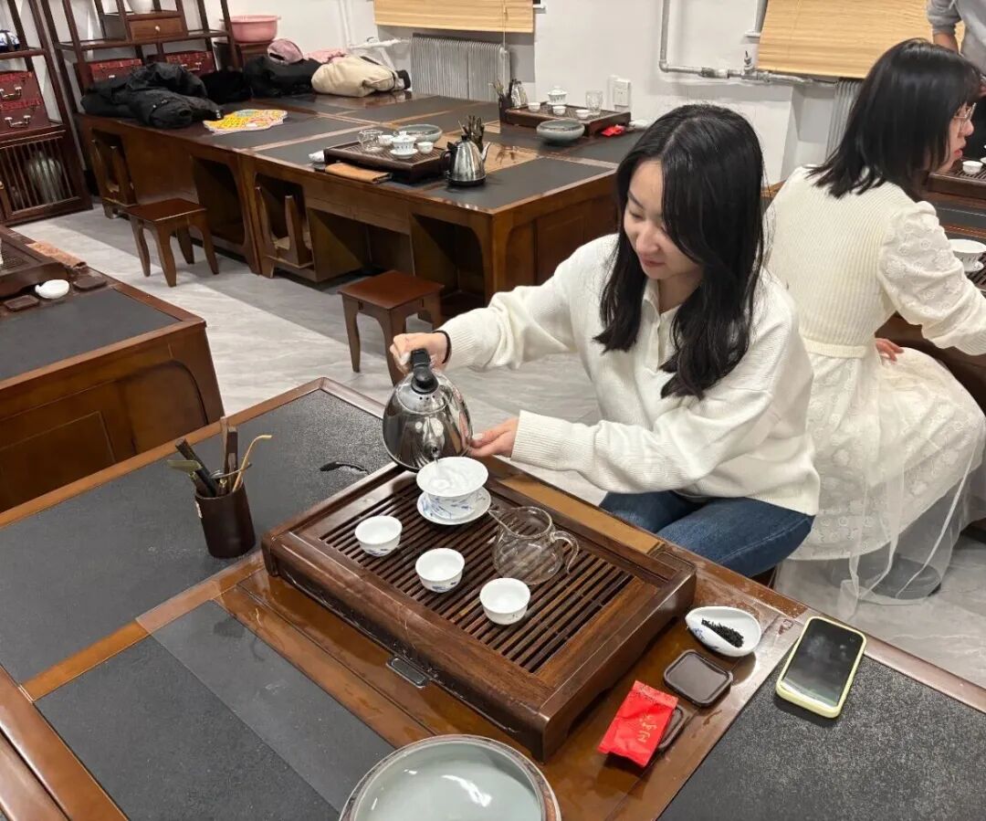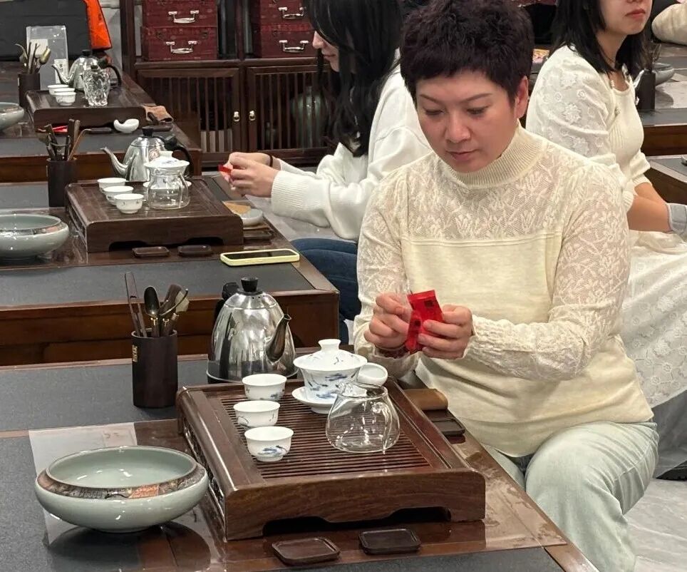 本期課程由我校旅游商務(wù)學(xué)院王廷老師擔(dān)任主講。課程圍繞“識(shí)茶、習(xí)藝、品茗、修身”四大模塊展開,王廷老師帶領(lǐng)學(xué)員系統(tǒng)了解茶葉從采摘到制作的工藝過(guò)程,細(xì)致講解不同茶類的特點(diǎn)與沖泡要領(lǐng)。在實(shí)踐環(huán)節(jié)中,學(xué)員們親手操作蓋碗、品茗杯等茶具,學(xué)習(xí)控制水溫、注水節(jié)奏與出湯時(shí)間,體驗(yàn)從溫具到奉茶的完整流程。整個(gè)教學(xué)過(guò)程中,學(xué)員們或凝神聆聽,或?qū)W?shí)踐,在王廷老師的悉心指導(dǎo)下漸入佳境。茶香裊裊中,大家靜心品茗、交流感悟,在傳統(tǒng)茶道禮儀中修養(yǎng)心性、結(jié)識(shí)知己,營(yíng)造出寧?kù)o而融洽的學(xué)習(xí)氛圍。