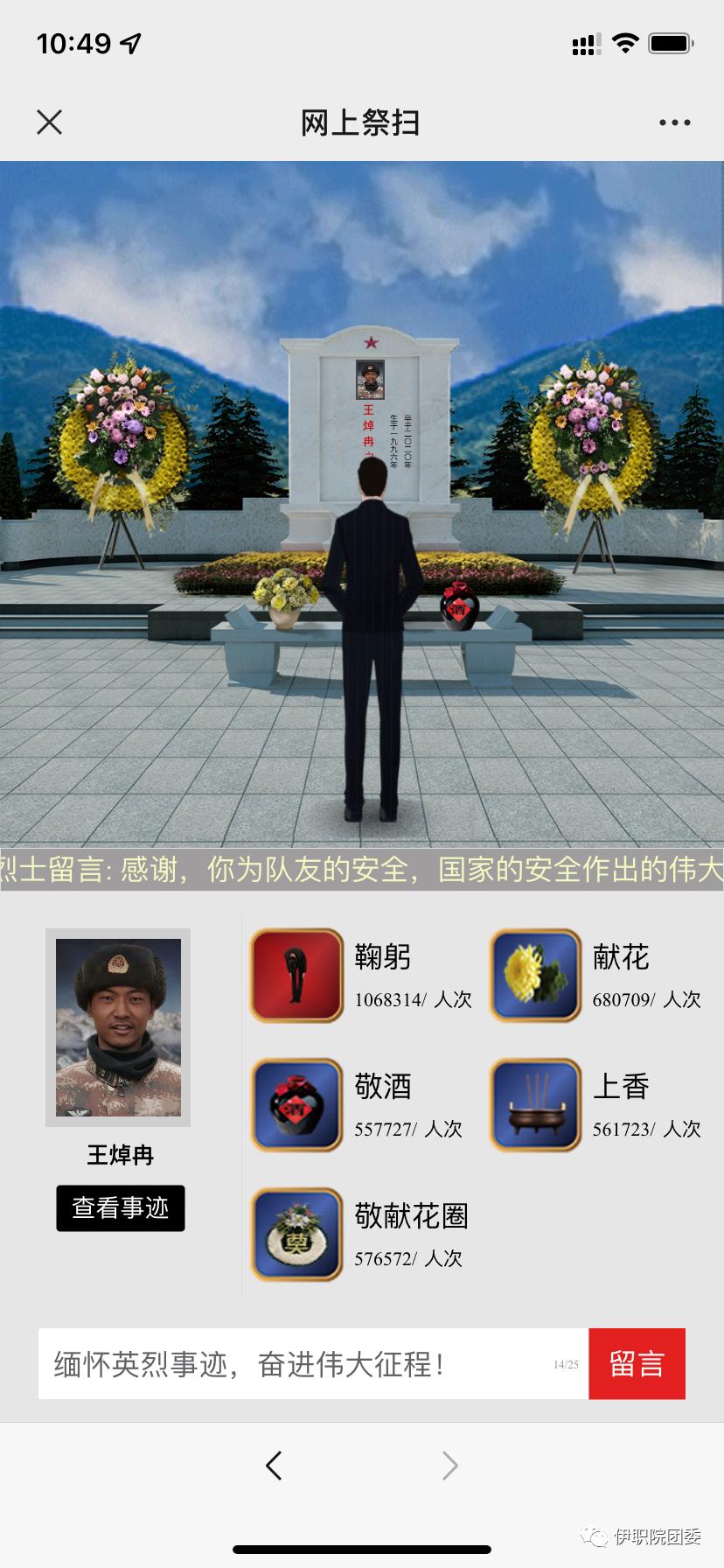 網(wǎng)上云祭掃、留言寄哀思。因疫情防控的原因,同學(xué)們在自己的電腦上、手機上,參加“清明祭英烈,線上敬哀思”活動,用這種特別的方式來來祭奠先烈。同學(xué)們看到了烈士們?yōu)樽鎳鵀槿嗣駫侇^顱、灑熱血,不惜犧牲生命的感人事跡,深刻體會到了先烈們堅貞不屈、英勇無畏的高貴品質(zhì)和革命精神。通過網(wǎng)上平臺,向革命先烈寄語獻花、鞠躬,表達緬懷和崇敬之情,并留下許多感人肺腑的深情寄語。