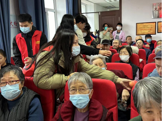 志愿者服務(wù)隊的同學(xué)們帶著水果、點心來到福利院,熱情地為老人分發(fā),老人們的臉上滿是喜悅。