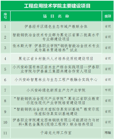 工程應(yīng)用技術(shù)學(xué)院積極參與國(guó)家、省重大項(xiàng)目建設(shè),近五年年工程應(yīng)用技術(shù)學(xué)院申請(qǐng)獲批或承接了省、市級(jí)項(xiàng)目13項(xiàng),包括黑龍江省高等學(xué)校資源型產(chǎn)業(yè)發(fā)展和裝備制造業(yè)緊缺人才培養(yǎng)培訓(xùn)基地項(xiàng)目、黑龍江省鄉(xiāng)村振興人才培養(yǎng)優(yōu)質(zhì)校、鋼鐵智能冶金技術(shù)專業(yè)成為高本貫通培養(yǎng)首批試點(diǎn)專業(yè)、智能鋼鐵冶金技術(shù)虛擬仿真實(shí)訓(xùn)基地獲批省級(jí)職業(yè)教育示范性虛擬仿真實(shí)訓(xùn)基地建設(shè)等十余個(gè)項(xiàng)目,獲得省和國(guó)家各項(xiàng)支持獎(jiǎng)補(bǔ)資金達(dá)2500余萬元。