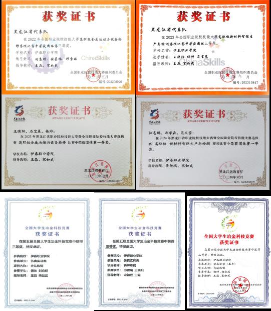 近三年學(xué)生獲省級(jí)及以上獎(jiǎng)項(xiàng)10項(xiàng),其中代表黑龍江省獲全國(guó)職業(yè)院校技能大賽金屬冶煉與設(shè)備檢修賽項(xiàng)和新材料智能生產(chǎn)與檢測(cè)賽項(xiàng)三等獎(jiǎng)各1項(xiàng)。