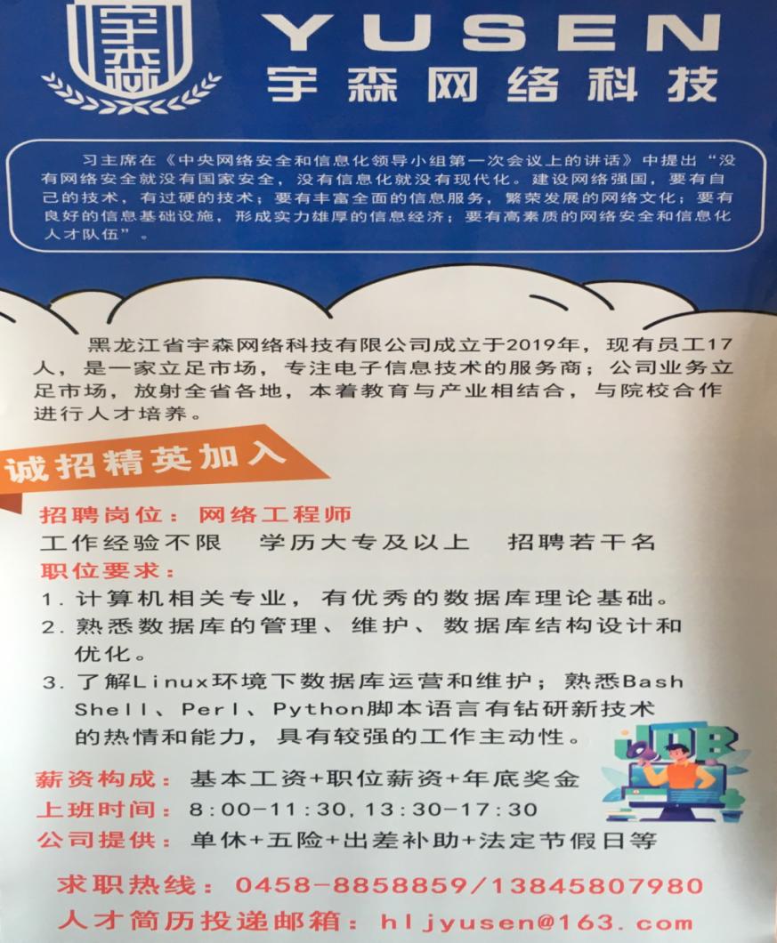 黑龍江省宇森網(wǎng)絡(luò)科技有限公司于2019年03月28日經(jīng)伊春市市場監(jiān)督管理局伊春分局批準(zhǔn)成立。為當(dāng)?shù)氐膶W(xué)生提供實習(xí)便利,公司兩位宣講人員給同學(xué)們介紹了到公司實習(xí)或者就業(yè)的相關(guān)要求和待遇問題,誠摯邀請同學(xué)們加盟到他們的工作團(tuán)隊中。