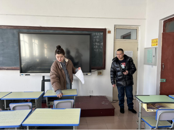 在教室,輔導員對地面、桌椅、門窗等進行了逐一檢查,并對教室的整潔度、物品擺放的整齊度以及衛(wèi)生死角的清理情況進行了重點關(guān)注,以確保新學期教學工作能夠順利開展。