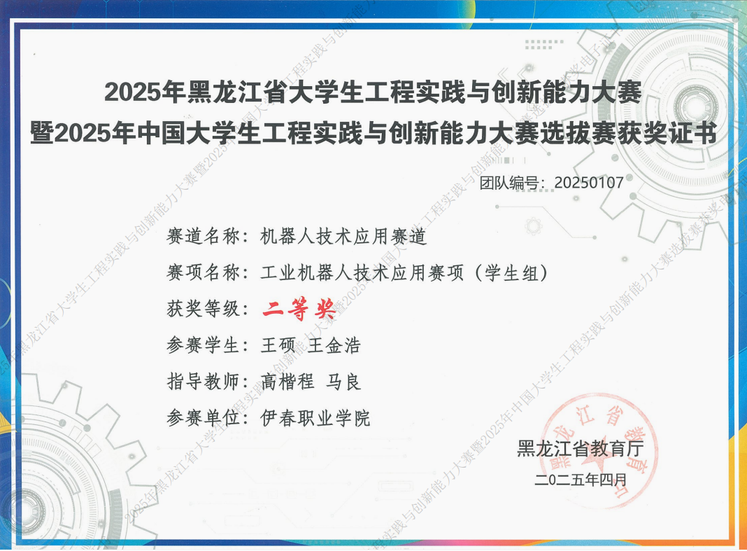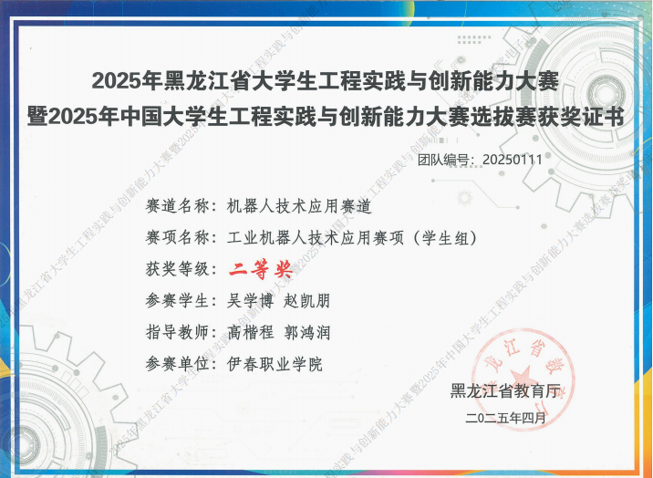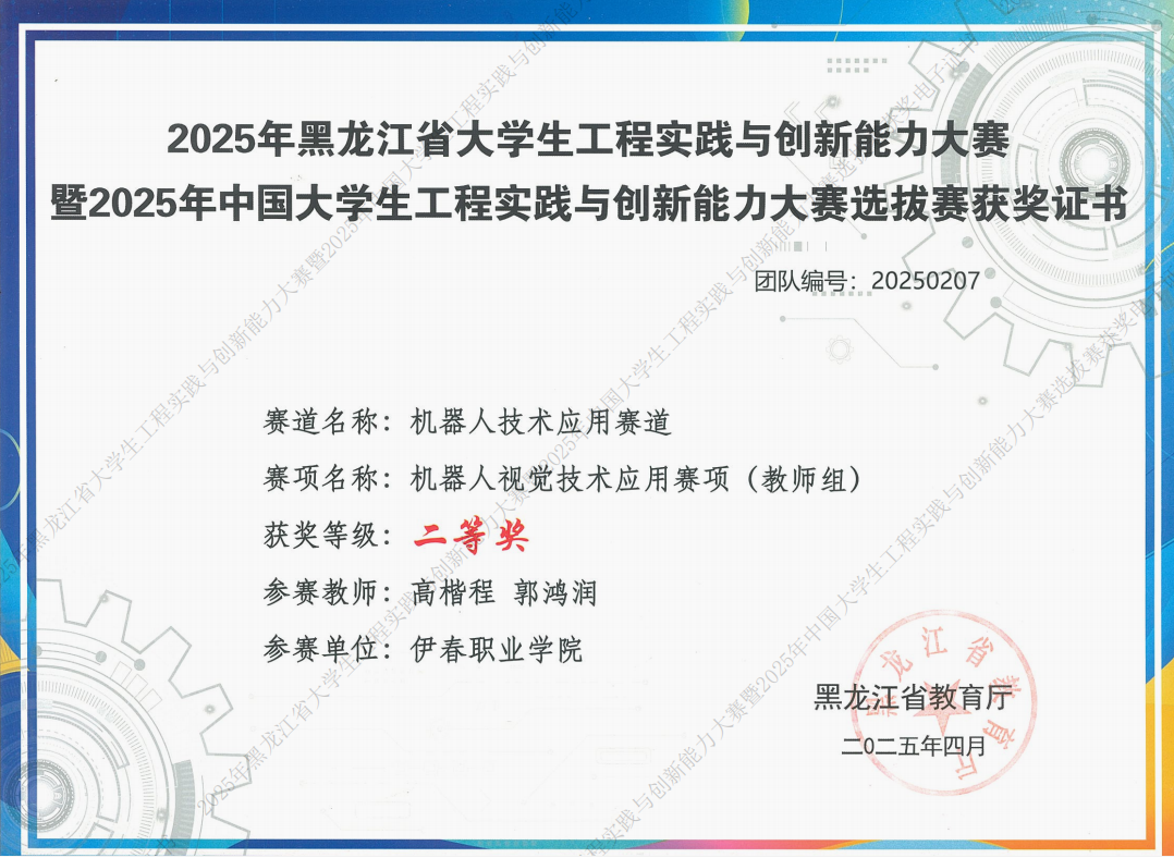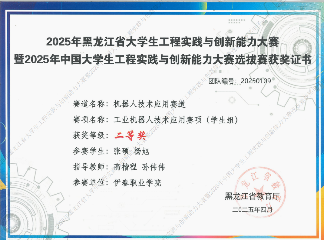 近日,2025年黑龍江省大學(xué)生工程實踐與創(chuàng)新能力大賽暨2025年中國大學(xué)生工程實踐與創(chuàng)新能力大賽選拔賽圓滿落幕。我院教師高楷程、郭鴻潤,2023級計算機(jī)應(yīng)用技術(shù)專業(yè)學(xué)生王碩、王金浩、張碩、楊旭、吳學(xué)博、趙凱朋憑借扎實的專業(yè)知識和默契的團(tuán)隊協(xié)作,在比賽中榮獲二等獎的好成績。