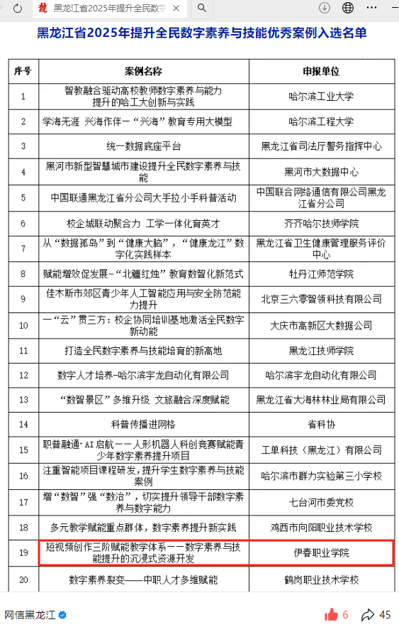 6月13日,項目啟動儀式在佳木斯市隆重舉行。在本次公布的20個省級優(yōu)秀案例中,申報單位有政府部門、本科高校、行業(yè)龍頭企業(yè)及技術(shù)公司等,高職院校入選者屈指可數(shù)。我校的成功獲批,凸顯了探索數(shù)字技術(shù)與職業(yè)教育深度融合、服務(wù)全民數(shù)字素養(yǎng)提升方面的前瞻性和實踐成效,實現(xiàn)了在該領(lǐng)域的突破。