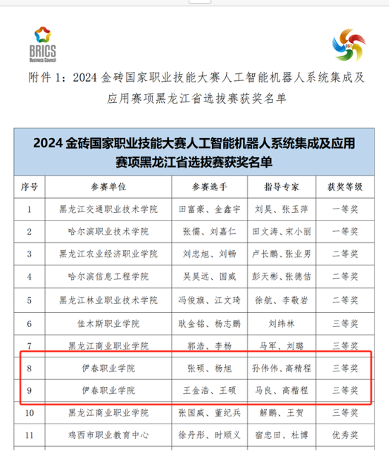 近日,2024金磚國家職業(yè)技能大賽人工智能機器人系統(tǒng)集成及應(yīng)用賽項黑龍江省選拔賽獲獎名單公布,在我院教師孫偉偉、馬良和高楷程的指導(dǎo)下,2023級計算機應(yīng)用技術(shù)專業(yè)學(xué)生張碩、楊旭、王金浩和王碩經(jīng)過激烈的角逐,最終脫穎而出,分別榮獲三等獎的好成績。
