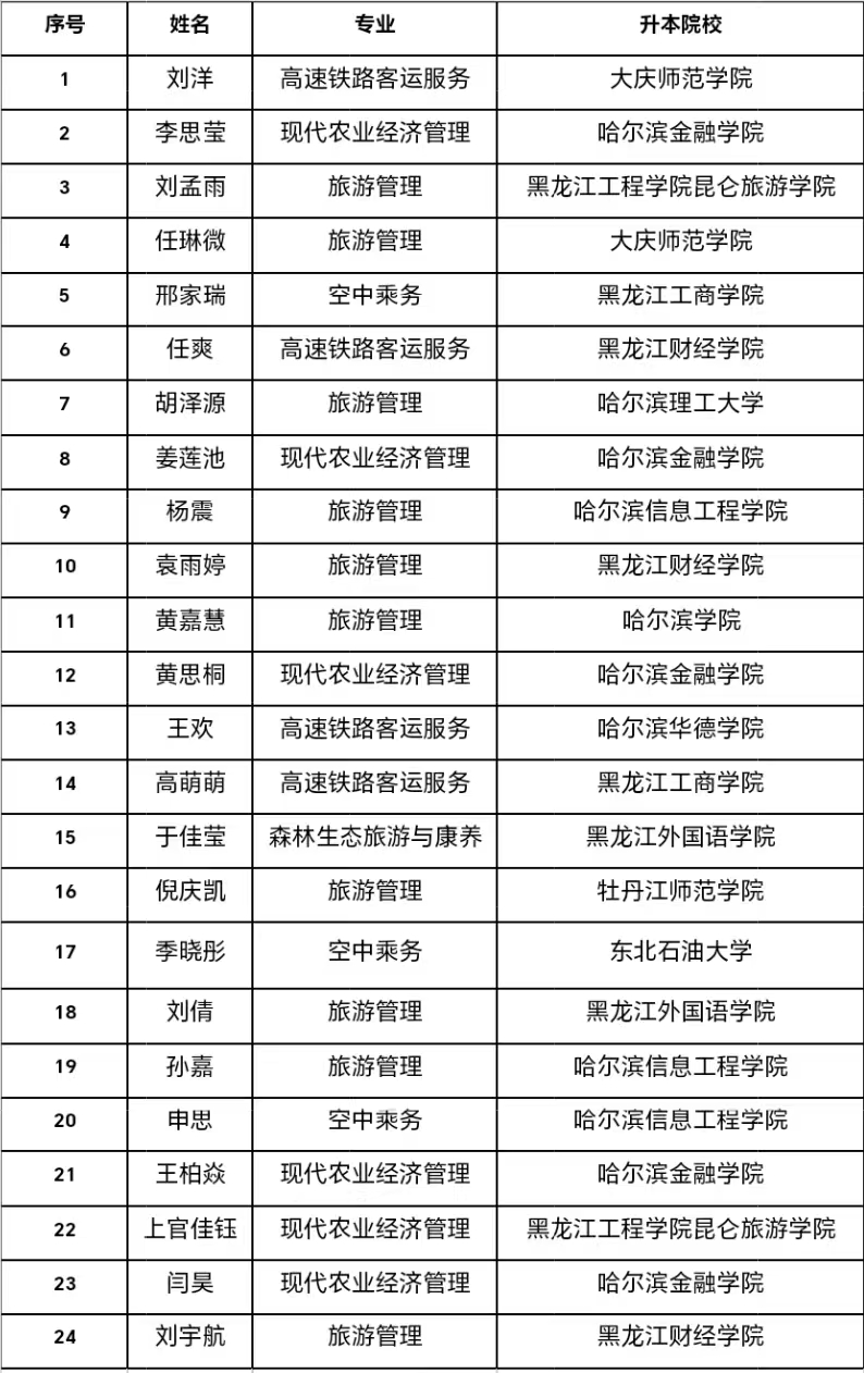 隨著2025年專升本錄取工作落下帷幕,我院2025屆畢業(yè)生在升學(xué)賽道上全力沖刺,交出了一份亮眼的答卷!此次專升本考試中,我院共有24名學(xué)子憑借扎實的專業(yè)知識與不懈的努力,成功被哈爾濱理工大學(xué)、大慶師范學(xué)院等多所省內(nèi)本科院校錄取,這份優(yōu)異的成績,既是學(xué)子們數(shù)年如一日刻苦鉆研的成果,也是學(xué)校堅持高質(zhì)量教育、深化教學(xué)改革的有力體現(xiàn)!每一次挑燈夜戰(zhàn)的堅持,每一回勤學(xué)苦練的執(zhí)著,都化作了通往理想學(xué)府的階梯。這些脫穎而出的優(yōu)秀學(xué)子,用拼搏與汗水詮釋了青春的力量,也為校園增添了榮耀與光彩!以下是旅游商務(wù)學(xué)院2025屆專升本錄取情況: