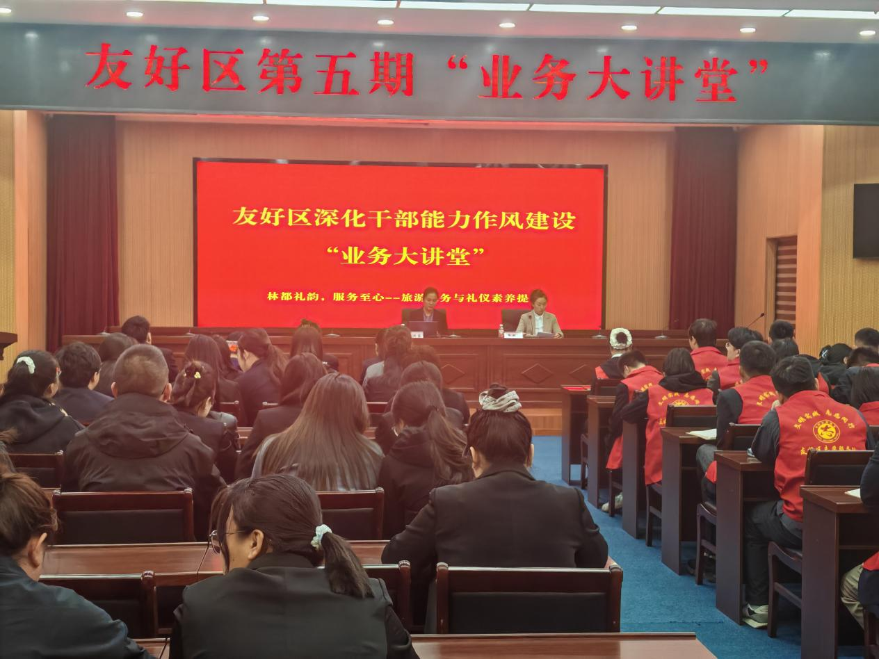 2025年5月16日,伊春市友好區(qū)第五期“干部能力作風(fēng)建設(shè)”業(yè)務(wù)大講堂成功舉辦。伊春職業(yè)學(xué)院旅游商務(wù)學(xué)院姚洪英老師受邀作《以禮塑形 以?xún)x潤(rùn)心——打造伊春文旅服務(wù)新名片》專(zhuān)題講座,為全區(qū)文旅干部及從業(yè)人員提供專(zhuān)業(yè)化禮儀培訓(xùn)。此次活動(dòng)既是校地合作的生動(dòng)實(shí)踐,也是學(xué)院服務(wù)地方文旅產(chǎn)業(yè)發(fā)展的創(chuàng)新舉措。