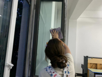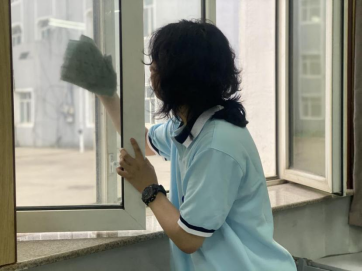 擦玻璃的同學(xué)發(fā)揮著不怕辛苦的精神,將玻璃清潔的光亮如新。