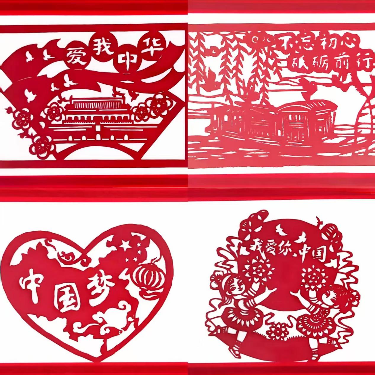小小剪紙,承載厚重歷史與滾燙信仰。在老師的悉心指導(dǎo)下,同學(xué)們巧手翻飛,匠心獨(dú)運(yùn)。南湖紅船剪影破浪,仿佛帶回星火初燃的莊嚴(yán)時(shí)刻,時(shí)刻激勵(lì)我們不忘初心、砥礪前行;飄揚(yáng)著“愛(ài)我中華”的鮮艷旗幟在天安門(mén)前熠熠生輝,輝映著革命先輩滿(mǎn)懷愛(ài)國(guó)精神的崢嶸歲月;交織著華夏國(guó)土的中國(guó)夢(mèng)圖案莊嚴(yán)神圣;新時(shí)代奮斗者與錦繡山河的畫(huà)卷生機(jī)盎然。一幅幅作品線(xiàn)條遒勁,意象鮮明,娓娓訴說(shuō)著對(duì)黨的無(wú)限忠誠(chéng)與身為中華兒女的無(wú)比自豪。