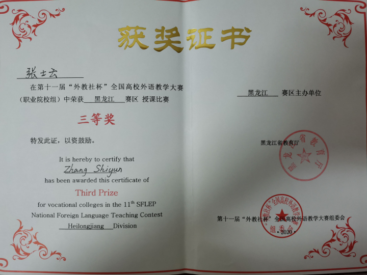 2. 張士云、王琳、趙莉莉喜獲2020年黑龍江省高等學(xué)校“教學(xué)之星”外語(yǔ)金課團(tuán)隊(duì)大賽(高職組)三等獎(jiǎng),主辦單位:黑龍江省教育廳。