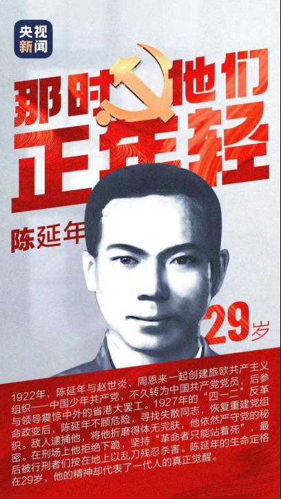 “陳延年,中國(guó)共產(chǎn)黨第五屆中央政治局候補(bǔ)委員,革命烈士。1927年在上海被捕,寧死不跪,被國(guó)民黨反動(dòng)派亂刀砍死,時(shí)年29歲。”