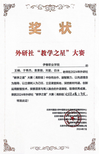 7月16日,2024年全國高等職業(yè)學(xué)校外研社“教學(xué)之星”大賽(高職組)決賽在安徽合肥圓滿落幕。來自公共教學(xué)部英語教研室的王楠、于秀杰、袁景麗、劉星、白冰教學(xué)團隊榮獲全國總決賽三等獎。