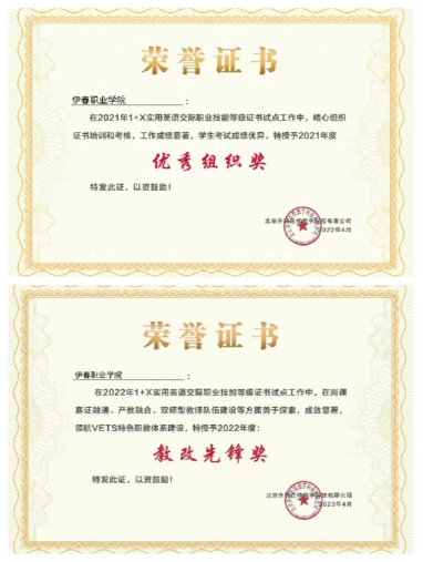 2021年我校成為首批“1+X”實(shí)用英語交際職業(yè)技能等級證書試點(diǎn)院校,結(jié)合我校實(shí)際,組織“1+X”證書師資培訓(xùn)和學(xué)生報(bào)名、培訓(xùn)、考核與發(fā)證等工作。截止目前,已有8名教師取得了初級培訓(xùn)師證書和考評員證書,2名教師取得了中級培訓(xùn)師證書和考評員證書。共組織了141名學(xué)生參加該證書培訓(xùn)考核,通過率為98%,考試參考人數(shù)和通過率均位居全國前列,連續(xù)兩年榮獲“1+X”證書培訓(xùn)評價(jià)組織——北京外研在線數(shù)字科技有限公司授予“優(yōu)秀組織獎”和“教改先鋒獎”。