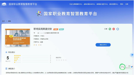 依托“1+X”實(shí)用英語交際職業(yè)技能等級證書活頁式教材建設(shè)的《職場實(shí)用英語交際》在線精品開放課程,于2021年1月開始建設(shè),10月入選學(xué)銀在線,現(xiàn)已使用第四期。共建設(shè)課程資源88個(gè),累計(jì)選課人數(shù)4260人,頁面瀏覽量1895158次,累計(jì)互動人數(shù)6445人。2022年12月該課程被收錄至教育部職業(yè)教育智慧教育平臺。