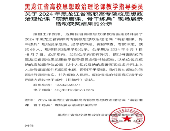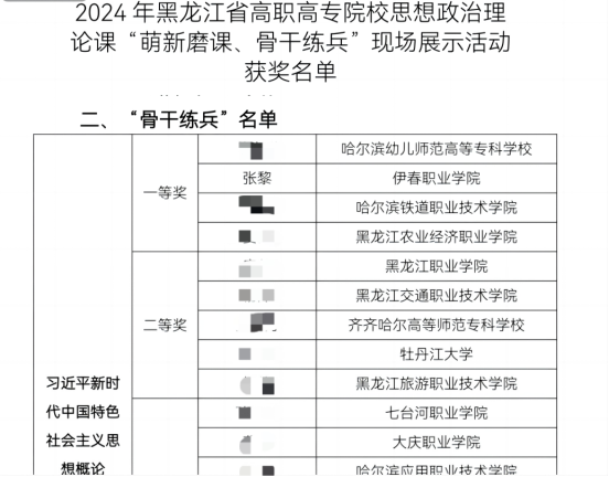 我校思政部教師張黎在黑龍江省高校思想政治理論課教學指導(dǎo)委員會組織的2024年黑龍江省高職高專院校思想政治理論課“萌新磨課、骨干練兵”現(xiàn)場展示活動中獲《習近平新時代中國特色社會主義思想概論》課程“骨干練兵”組一等獎。