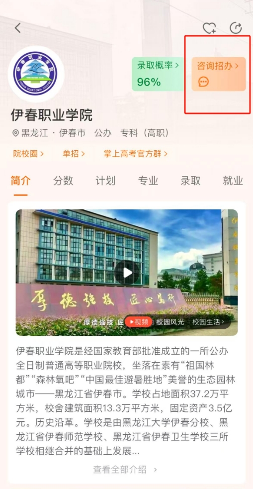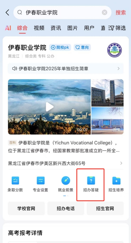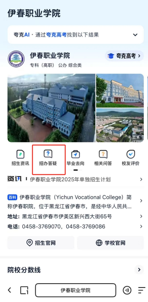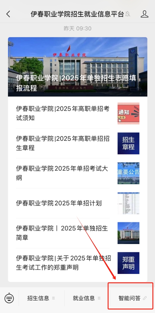 關(guān)注后可進(jìn)入到“【伊春職業(yè)學(xué)院招生就業(yè)信息平臺】”微信公眾號主頁,點(diǎn)擊底欄“智能問答”即可在線咨詢。公眾號招生咨詢平臺問答頁同時支持語音提問。