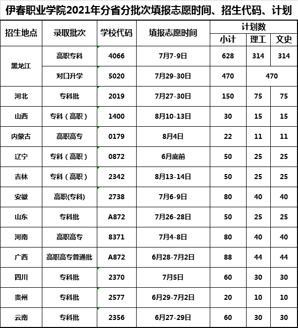 伊春職業(yè)學(xué)院2021年分省分批次填報志愿時間、招生代碼、計劃