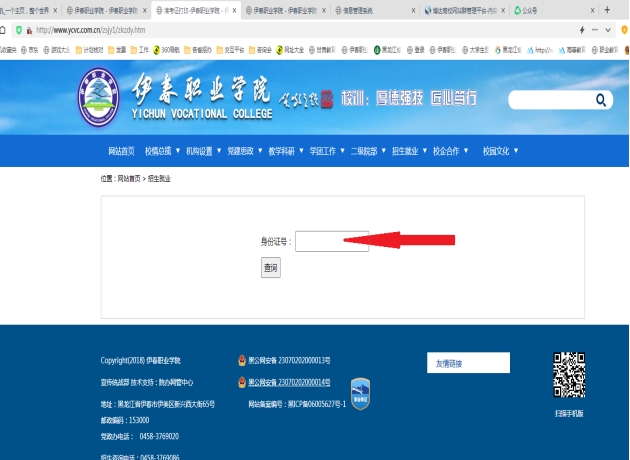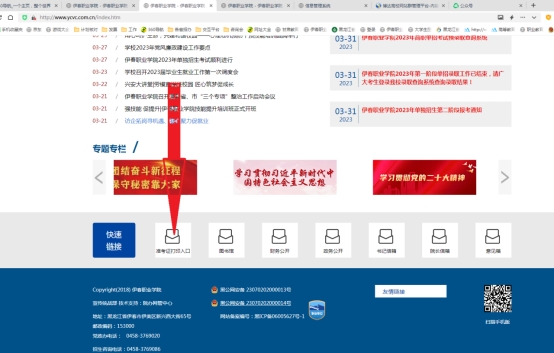 第一步:使用電腦端(PC端)登錄伊春職業(yè)學(xué)院官方網(wǎng)站(www.ycvc.com.cn),在首面底端快速鏈接欄目下點(diǎn)擊 “準(zhǔn)考證打印入口”;