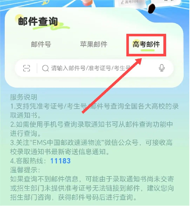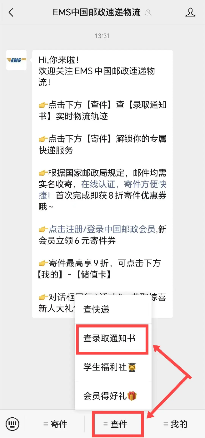 (2)關(guān)注后進(jìn)入對(duì)話頁(yè)面,選擇“查件”板塊,點(diǎn)擊“查錄取通知書(shū)”,進(jìn)入后點(diǎn)擊“高考郵件”,輸入考生號(hào)等信息即可進(jìn)行查詢或點(diǎn)擊“郵件號(hào)”,輸入考生郵寄單號(hào)(到我校官網(wǎng)查詢)即可進(jìn)行查詢。