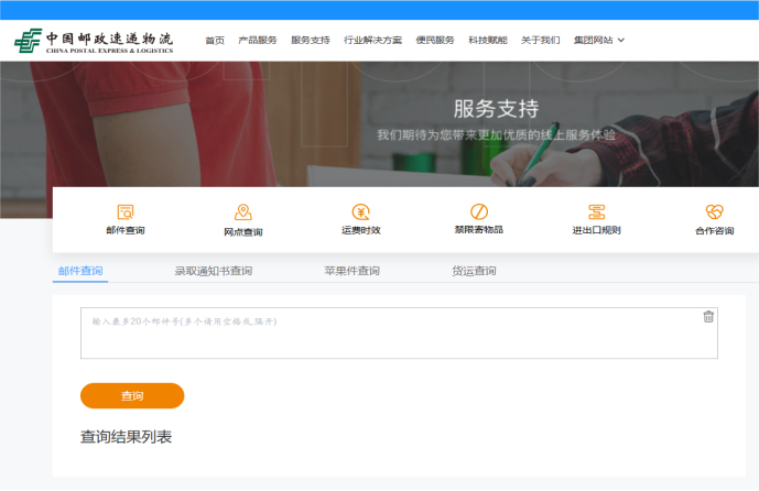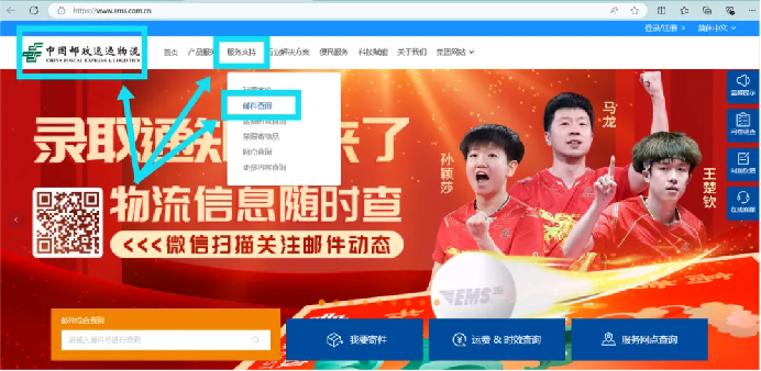 (1)在瀏覽器中搜索EMS官網(wǎng)后進(jìn)入首頁(yè),選擇欄目中的“服務(wù)支持”,點(diǎn)擊“郵件查詢”板塊;