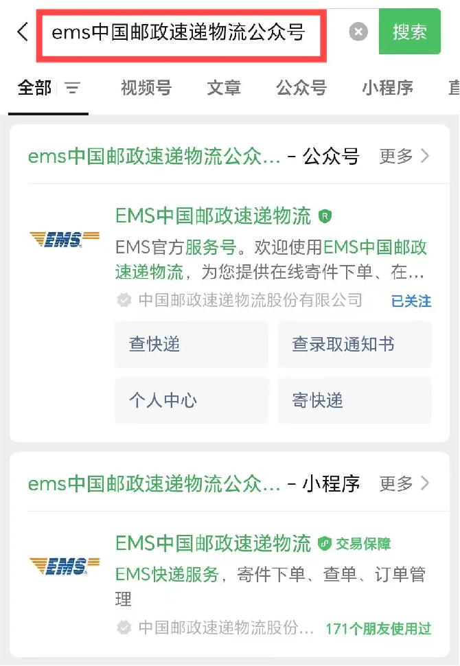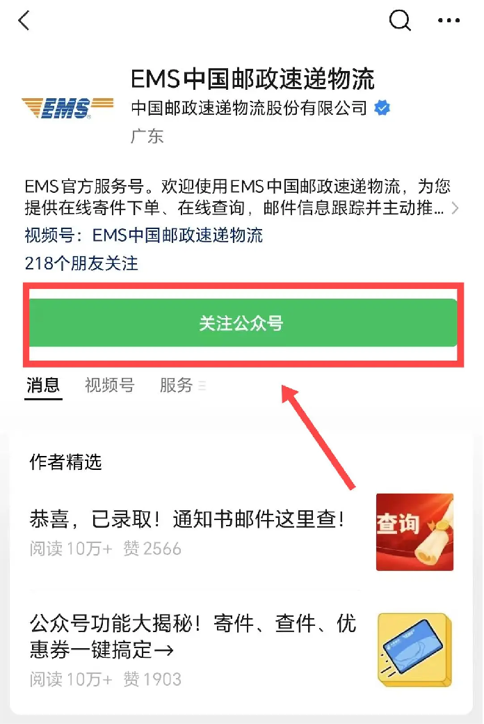 (1)微信搜索“EMS中國(guó)郵政速遞物流”公眾號(hào),并點(diǎn)擊關(guān)注;
