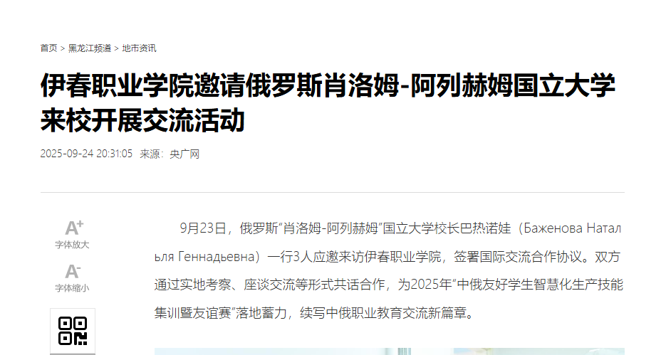 9月23日,俄羅斯“肖洛姆-阿列赫姆”國立大學(xué)校長巴熱諾娃(Баженова Натальля Геннадьевна)一行3人應(yīng)邀來訪我院,簽署國際交流合作協(xié)議。雙方通過實地考察、座談交流等形式共話合作,為2025年“中俄友好學(xué)生智慧化生產(chǎn)技能集訓(xùn)暨友誼賽”落地蓄力,續(xù)寫中俄職業(yè)教育交流新篇章。