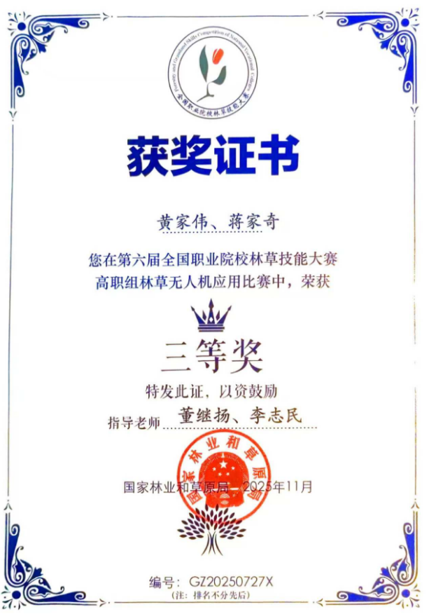 校領導對此次大賽高度重視,將其作為檢驗教學成果、錘煉學生技能、深化產教融合的重要契機。賽前,工程應用技術學院精心部署備戰(zhàn)工作,從選手選拔、師資配備到訓練方案制定均進行了系統(tǒng)規(guī)劃。此次我校共選派3支代表隊,分別征戰(zhàn)碳匯調查技術、林草病蟲害識別與防治、林草無人機應用技術三個賽項。最終,2024級林業(yè)技術學生朱浙雄獲得林草病蟲害識別與防治技術三等獎,2024級林業(yè)技術學生黃家偉和蔣家奇獲得林草無人機應用技術三等獎。