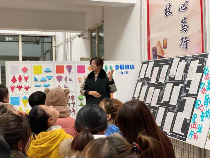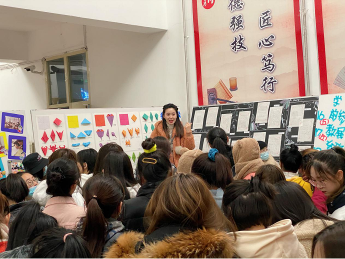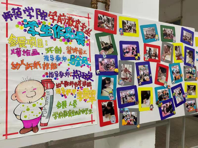 2020年11月12日晚,師范學(xué)院職業(yè)教育周活動在教學(xué)主樓一樓大廳啟動,本次活動重點(diǎn)展示了我院學(xué)前教育專業(yè)師生近一年來的部分教學(xué)成果,包括幼兒折紙、幼兒教師書寫、幼兒美工、環(huán)創(chuàng)等技能作品?;顒佑蓭煼秾W(xué)院王紅、邱微微老師組織,在校生近二百人參加。任課教師鄭璇、李恩翠、馬金鳳一一向在場同學(xué),尤其是學(xué)前教育、早期教育的新同學(xué)們,介紹了優(yōu)秀作品、相關(guān)課程內(nèi)容及專業(yè)技能要求,進(jìn)一步提高了學(xué)生對所學(xué)專業(yè)的認(rèn)知和對未來專業(yè)學(xué)習(xí)的期待。