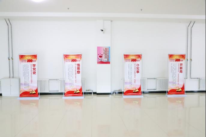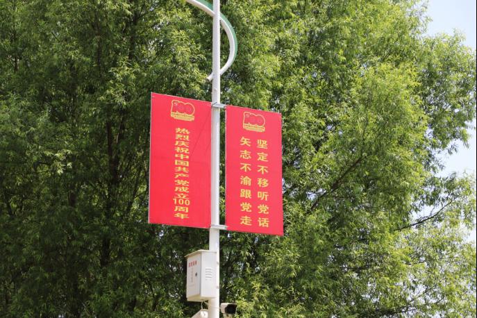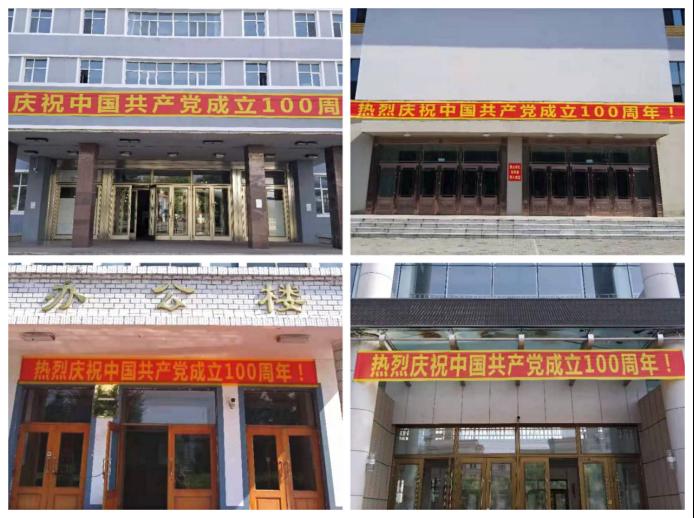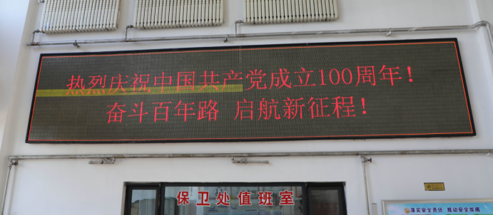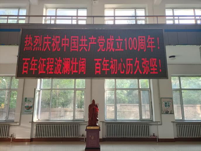 校園內(nèi)隨處可見“熱烈慶祝中國共產(chǎn)黨成立100周年”橫幅。教學(xué)樓、圖書館兩處電子屏不間斷滾動播出慶祝建黨百年宣傳標(biāo)識和標(biāo)語,為中國共產(chǎn)黨成立100周年“亮屏”。