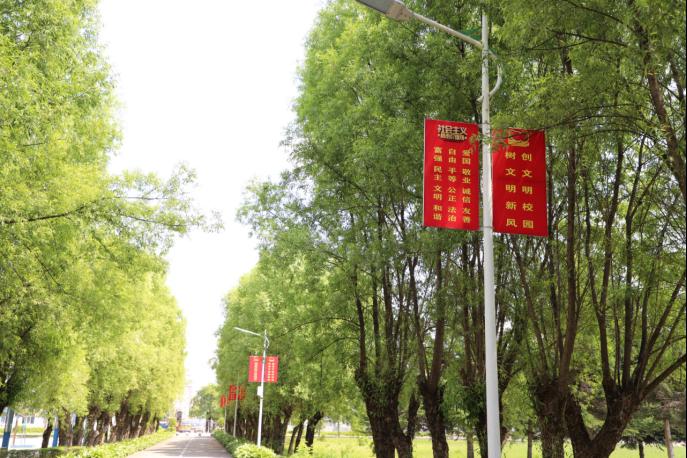 大門入口處、人行道旁整排燈桿兒上高掛的“百年征程波瀾壯闊 百年初心歷久彌堅(jiān)”“堅(jiān)定不移聽黨話 矢志不渝跟黨走”、“創(chuàng)文明校園 樹文明新風(fēng) ”“微笑是最美的語言 文明是最好的名片”等宣傳牌為這火紅的日子增添了亮麗的色彩。