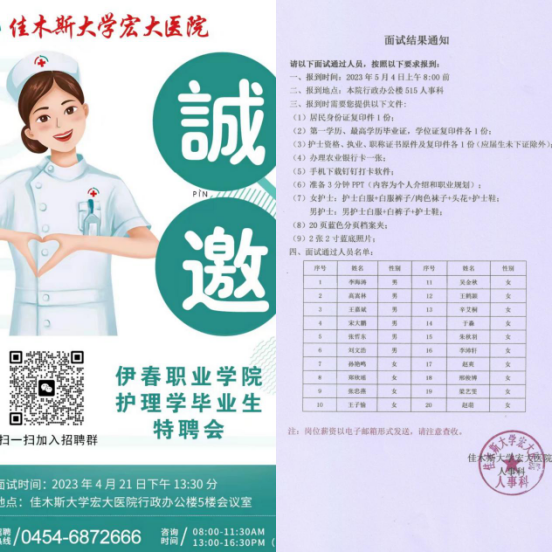 4月10日我校2023屆畢業(yè)生春季線下雙選會佳木斯大學(xué)宏大醫(yī)院也積極參與,受到畢業(yè)生的關(guān)注,遞交簡歷近百份。隨后招就處多次與佳木斯宏大醫(yī)院進(jìn)行交流溝通,4月21日佳木斯宏大醫(yī)院專門針對53名有就業(yè)意向的畢業(yè)生組織了“伊春職業(yè)學(xué)院護(hù)理專業(yè)學(xué)生特聘會”,最終20名畢業(yè)生通過面試被正式聘用,即將履行入職手續(xù),同時(shí)雙方約定將持續(xù)開展招聘活動。