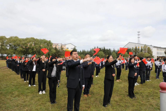 升旗儀式后,楊繼新老師領(lǐng)唱《我和我的祖國(guó)》,全校師生共同齊唱,揮動(dòng)著手中鮮艷的五星紅旗,這一抹紅是對(duì)祖國(guó)的深深的祝福和美好祝愿。