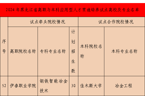 4月25日,黑龍江省教育廳公布了《省教育廳關(guān)于公布2024年黑龍江省高職與本科應(yīng)用型人才貫通培養(yǎng)試點(diǎn)高校及專業(yè)名單的通知》,伊春職業(yè)學(xué)院鋼鐵智能冶金技術(shù)專業(yè)再次列入省高本貫通培養(yǎng)試點(diǎn)專業(yè)名單。2024年我校鋼鐵智能冶金技術(shù)專業(yè)與佳木斯大學(xué)冶金工程專業(yè)繼續(xù)開展五年制本科教育“高本貫通”培養(yǎng),面向省內(nèi)普通高考生招生,高職提前批次錄取,計(jì)劃錄取30人。