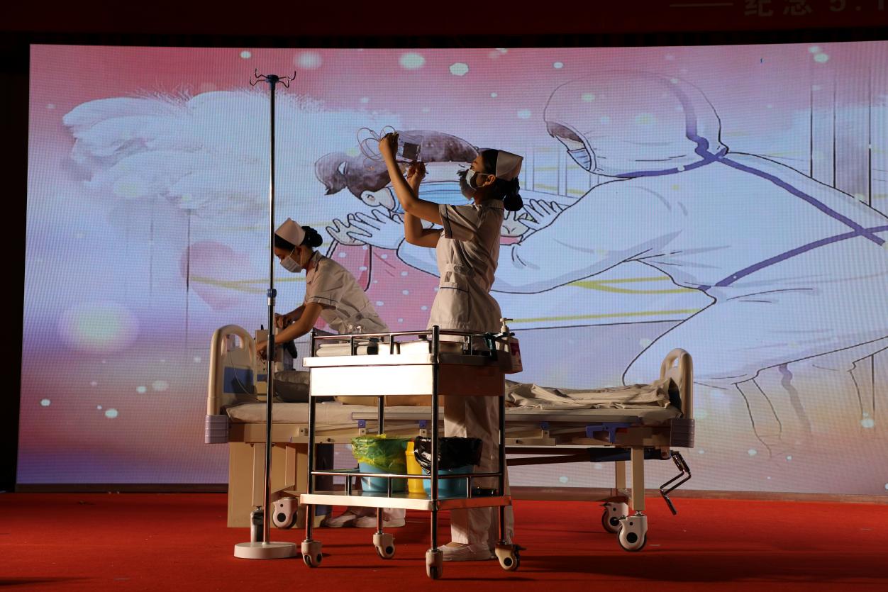 我校男教師表演的三句半《伊職教育譜新篇》精彩絕倫,再一次將演出推向高潮。使命在肩,初心如磐,當祖國和人民需要我們時,我們氣蕩山河足音鏗鏘,白衣執(zhí)甲、逆行出征;當祖國和人民需要我們時,我們臨危受命奮勇?lián)?。師生情景劇《當祖國需要時》感動了全場。