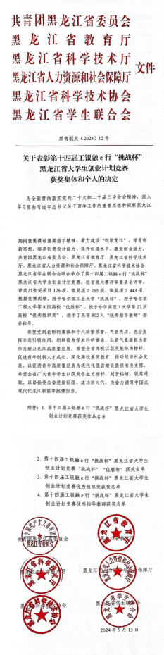 近日,由共青團黑龍江省委員會、黑龍江省教育廳、黑龍江省科學技術廳、黑龍江省人力資源和社會保障廳、黑龍江省科學技術協(xié)會、黑龍江省學生聯(lián)合會共同主辦、中國工商銀行黑龍江省分行支持的第十四屆工銀融e行“挑戰(zhàn)杯”黑龍江省大學生創(chuàng)業(yè)計劃競賽公布獲獎情況。