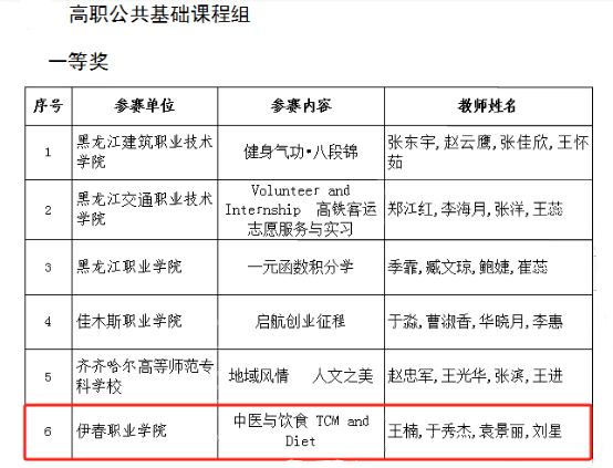 我校公共教學部英語教研室教師團隊精心準備的《中醫(yī)與飲食 TCM and Diet》課程,在高職公共基礎課程組別中以絕對優(yōu)勢榮獲一等獎。該課程秉承“以學生為中心”的教學理念,結合線上線下混合式教學,面對國際患者創(chuàng)設中醫(yī)職業(yè)應用場景,促進英語核心與中醫(yī)職業(yè)素養(yǎng)雙提升,深受評委喜愛與好評。