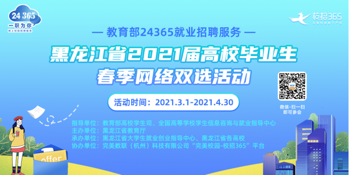 為扎實做好“2021屆全國普通高校畢業(yè)生就業(yè)創(chuàng)業(yè)促進行動”,搭建高校畢業(yè)生就業(yè)供需對接平臺,降低疫情對黑龍江省高校畢業(yè)生就業(yè)工作的影響,現(xiàn)定于2021年3月1日至4月30日舉辦“教育部24365就業(yè)招聘服務(wù)·黑龍江省2021屆高校畢業(yè)生春季網(wǎng)絡(luò)雙選活動”,助力高校畢業(yè)生更充分、更高質(zhì)量就業(yè)?;顒泳唧w通知如下: