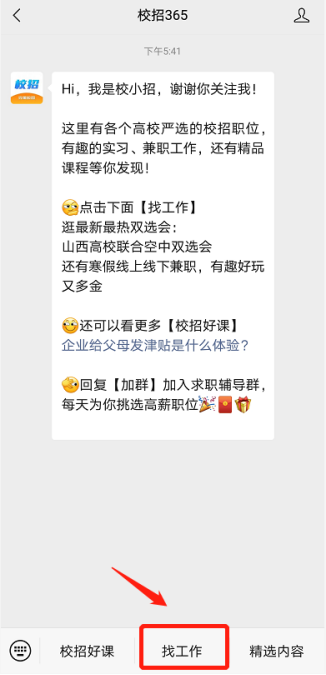 (1)長按二維碼關(guān)注“校招365”微信公眾號,打開菜單欄【找工作】