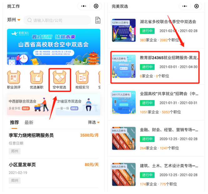 (2)進入【找工作】,點擊【空中雙選】按鈕,找到【教育部24365就業(yè)招聘服務(wù)·黑龍江省2021屆高校畢業(yè)生春季網(wǎng)絡(luò)雙選活動】,進入活動,選擇心儀崗位,即可投遞簡歷。