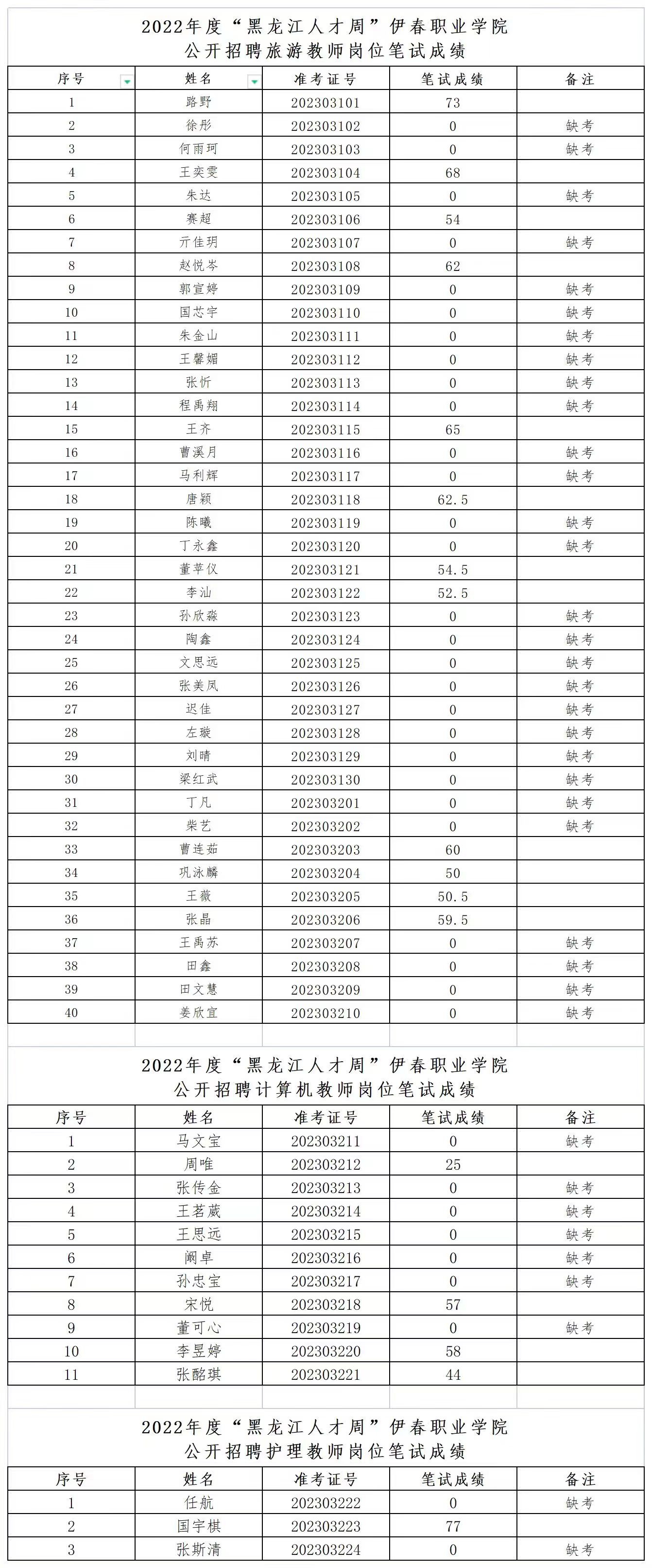 附件:2022年度“黑龍江人才周”伊春職業(yè)學(xué)院公開(kāi)招聘旅游教師、計(jì)算機(jī)教師、護(hù)理教師崗位筆試成績(jī)
