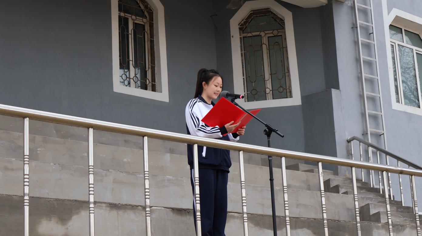 學生代表袁子婷同學在國旗下以激昂的話語號召全體學生傳承五四精神,在新時代勇擔使命,勤奮學習,用知識武裝自己,以青春之我、奮斗之我,為民族復興鋪路架橋,為祖國建設添磚加瓦,她的言語充滿了青春的活力和對未來的憧憬,展現了新時代青年的風采與擔當。