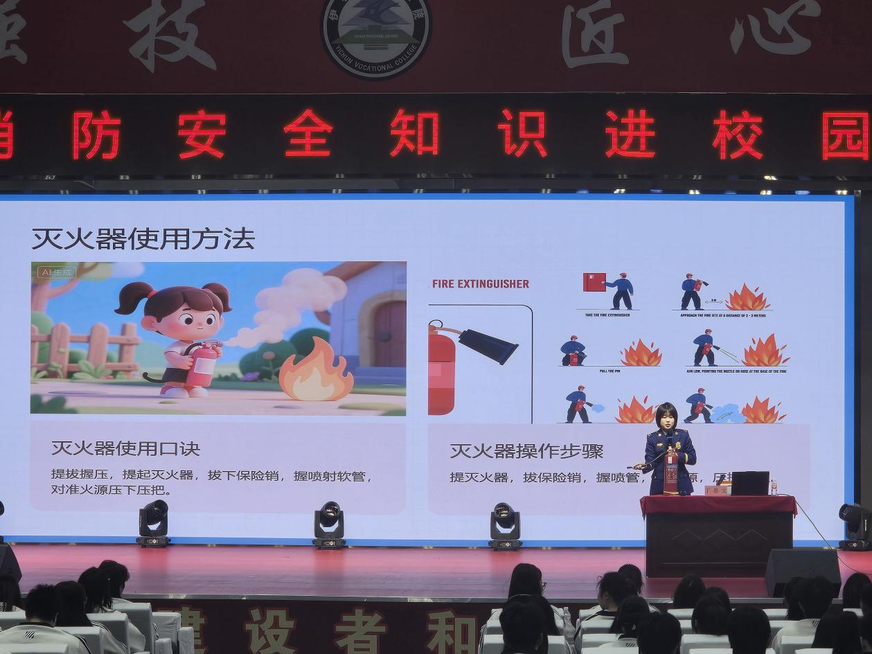 講座上,丁思文結合火災真實案例,生動講解了在宿舍違規(guī)使用電器等行為存在的巨大隱患,并特別強調:“人走斷電”,人員離開宿舍時需及時關閉電源、杜絕明火。此外,她還在現(xiàn)場演示了滅火器的正確使用方法,引導學生掌握了撲救初期火災的關鍵技能。現(xiàn)場的同學們認真聆聽、積極互動,對消防安全有了更為深刻的認識。