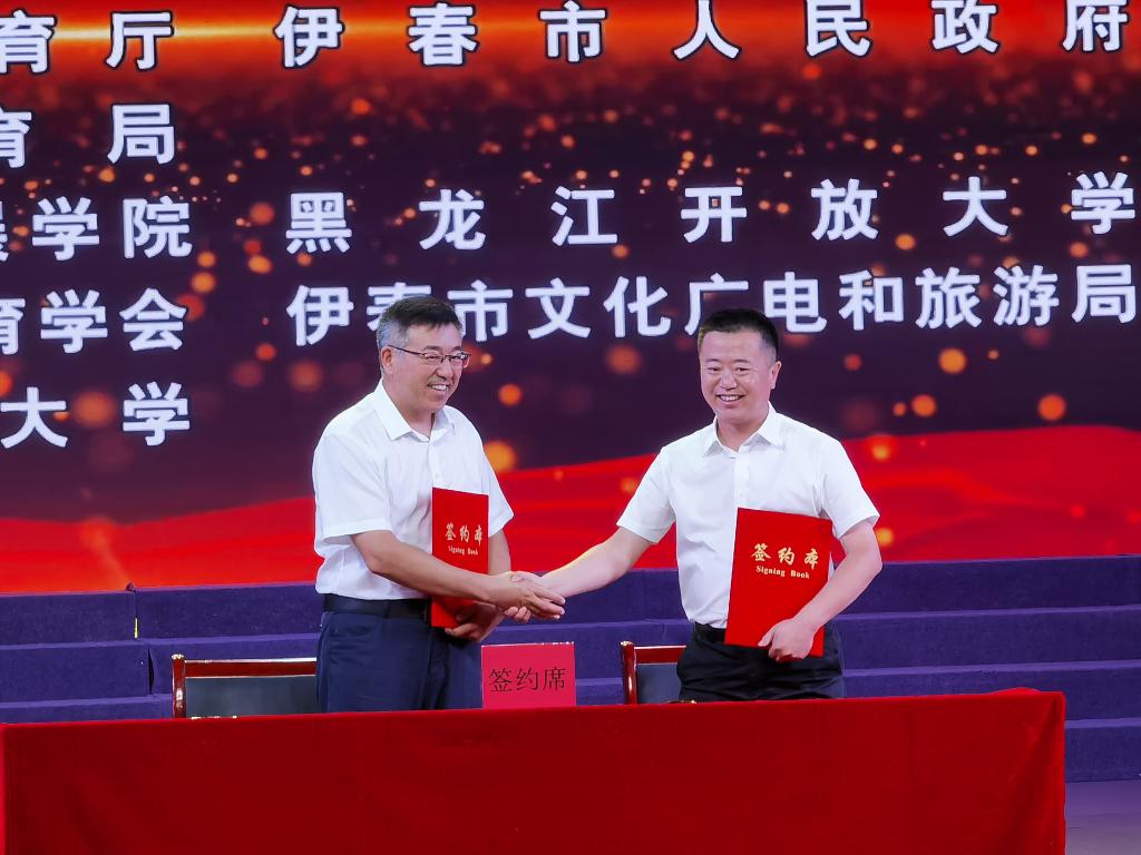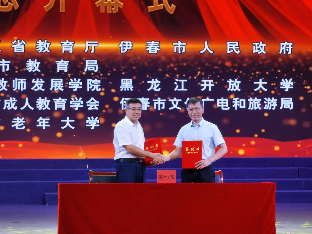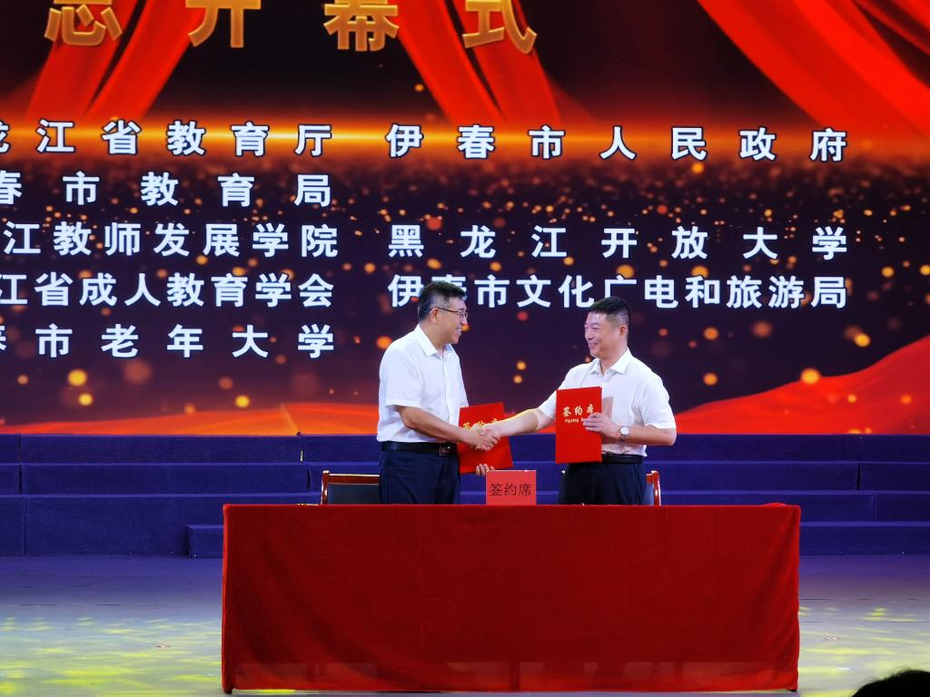 7月30日上午,以“大力發(fā)展老年教育 構(gòu)建終身教育體系”為主題的2022年黑龍江省“全民終身學(xué)習(xí)活動周”總開幕式在伊春林業(yè)藝術(shù)劇院舉行。在開幕式上,我校黨委書記麻昌杰與黑龍江伊春森工集團(tuán)有限責(zé)任公司、建龍西林鋼鐵有限公司、黑龍江拓盟科技有限公司簽訂校企合作協(xié)議。
