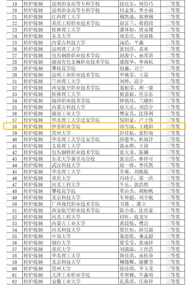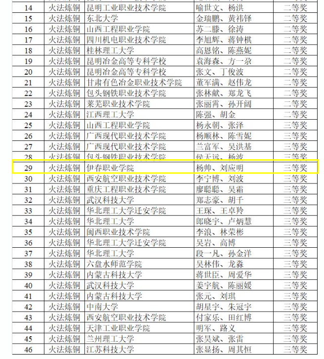 本屆競賽參賽學校共44所,其中高職???4所(煉鋼23組46人,煉銅23組46人),本科院校(含研究生)30所(煉鋼51組102人,煉銅34組68人)。煉鋼競賽項目:特等獎6組、一等獎10組、二等獎16組、三等獎30組;煉銅競賽項目:特等獎5組、一等獎7組、二等獎12組、三等獎22組。