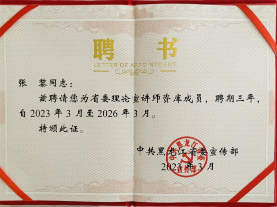 近日,經(jīng)省委宣傳部遴選我校思政部教師張黎同志被聘為省委理論宣講師資庫成員,聘期三年。