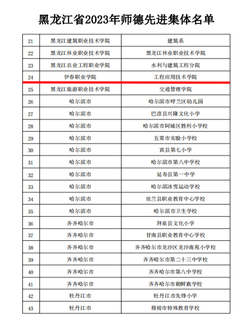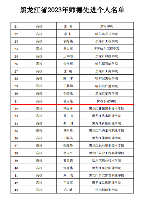 日前,黑龍江省教育廳公布了全省教育系統(tǒng)2023年師德先進集體和先進個人評選結(jié)果。我校工程應用技術學院被評為全省教育系統(tǒng)師德先進集體,郭玉蓮教授被評為全省教育系統(tǒng)師德先進個人。