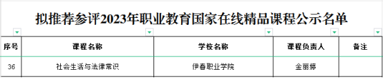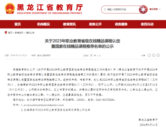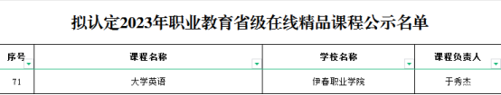 近日,黑龍江省教育廳發(fā)布了《關(guān)于2023年職業(yè)教育省級在線精品課程認定暨國家在線精品課程推薦名單的公示》,公布了黑龍江省2023年職業(yè)院校省級在線精品課程認定結(jié)果和國家在線精品課程推薦參評名單,我校申報的《社會生活與法律常識》課程被推薦參評2023年職業(yè)教育國家在線精品課程,《大學(xué)英語》課程被認定2023年職業(yè)教育省級在線精品課程。