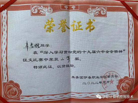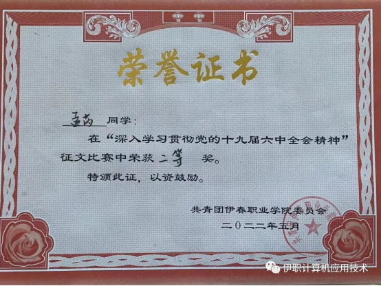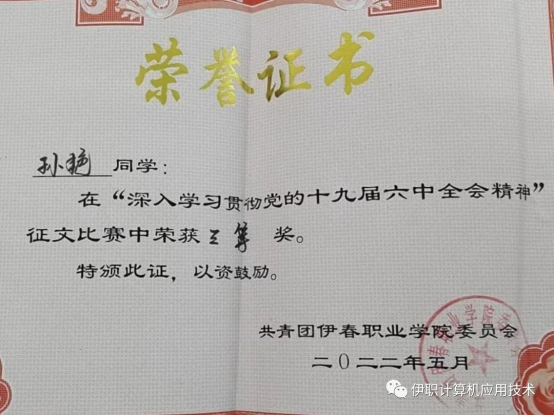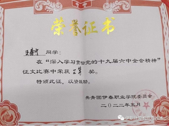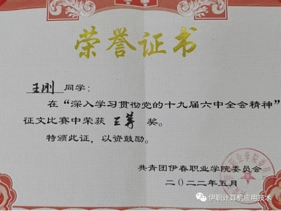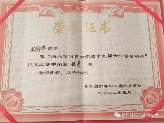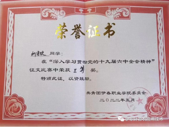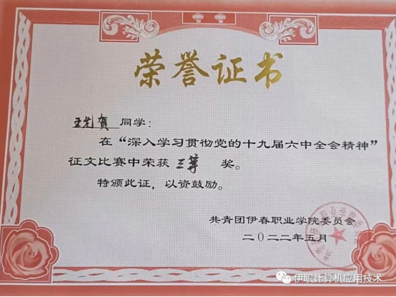 為深入開展黨史學(xué)習(xí)教育,認(rèn)真學(xué)習(xí)宣傳貫徹黨的十九屆六中全會(huì)精神,深刻領(lǐng)會(huì)黨的百年奮斗重大成就和歷史經(jīng)驗(yàn)。積極號(hào)召同學(xué)們不忘初心、牢記使命,做一名有為的新時(shí)代青年,為實(shí)現(xiàn)中華民族偉大復(fù)興不懈奮斗。校團(tuán)委圍繞全會(huì)精神和中國共產(chǎn)黨的百年奮斗歷程進(jìn)行熱烈的學(xué)習(xí)和交流,舉辦“深入學(xué)習(xí)貫徹黨的十九屆六中全會(huì)精神”征文比賽,計(jì)算機(jī)應(yīng)用技術(shù)學(xué)院學(xué)生積極參與,在此次征文比賽中取得十分優(yōu)異的成績!