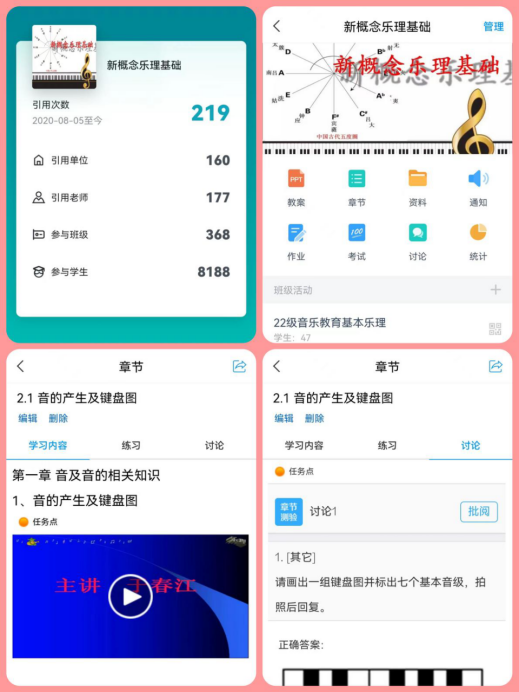 我院首門在線課程為2020年7月于春江老師獨(dú)立建設(shè)完成的網(wǎng)絡(luò)精品在線開放課程《新概念樂(lè)理基礎(chǔ)》,該課程先后被國(guó)內(nèi)160所本??圃盒?、共計(jì)8188名學(xué)生學(xué)習(xí)使用。